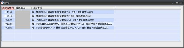 時,以滑鼠左鍵點擊[成交],會開啟「成交」畫面,揭示成交回報資訊。