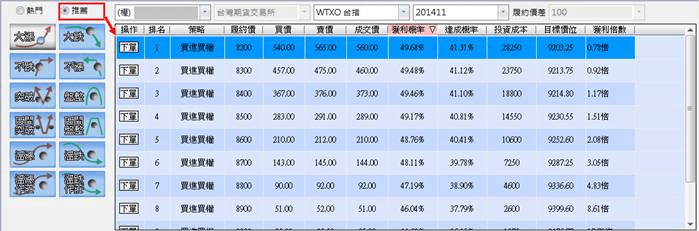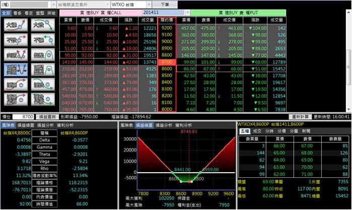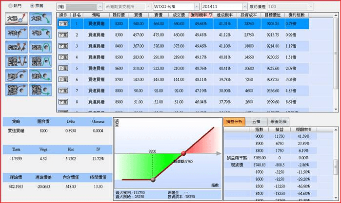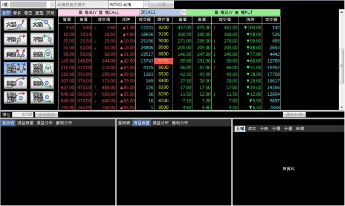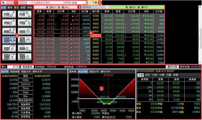 功能說明:提供國內選擇權十二種策略組合的商品盤勢並帶下單。
