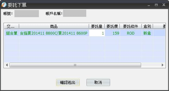 ->點選「下單」,彈出下單確認視窗,將該策略組合帶入,可修改<委託量>。