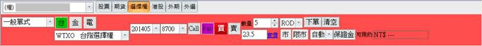 ->點選「台」、「金」、「電」icon,代表直接將台指選擇權、金融期選擇權、電子期選擇權近一月份的商品代碼帶入下單列。
