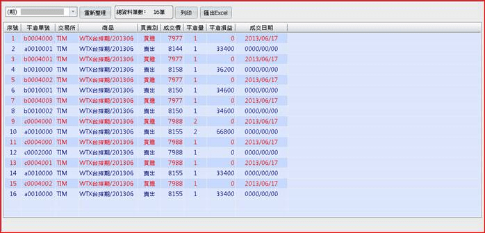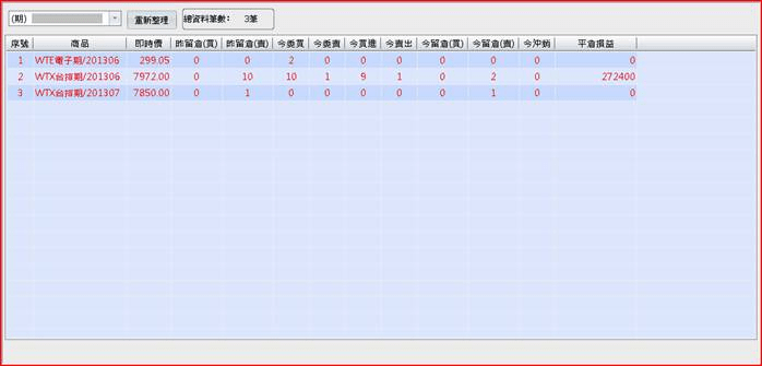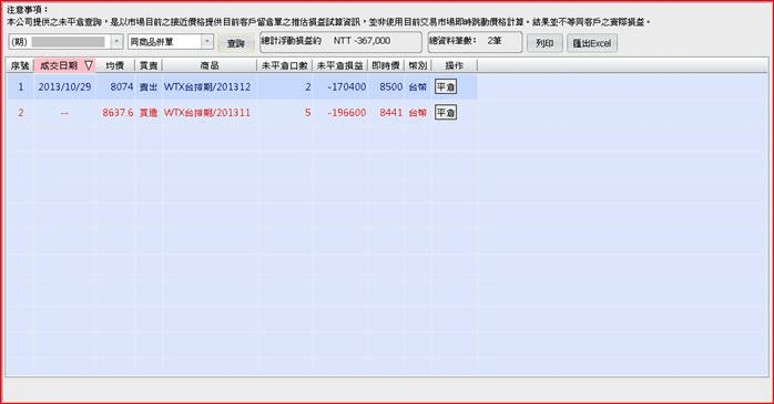 2.使用者可選擇「顯示全部明細」(所有未平倉明細)、「同商品併單」(將同一商品併單,並算出均價)。