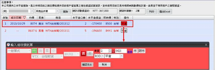 5.按下操作欄位中的「平倉」按鈕,系統將自動帶出反向部位,點選「確認送出」即可送出平倉委託單。