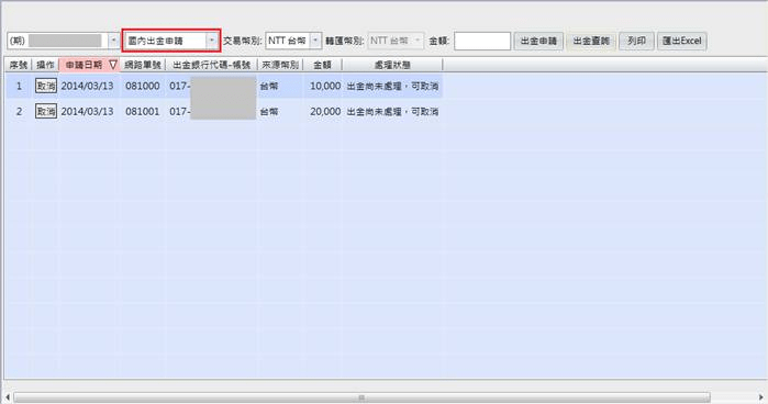 7.出金尚未處理者,可點選「取消」做出金取消。