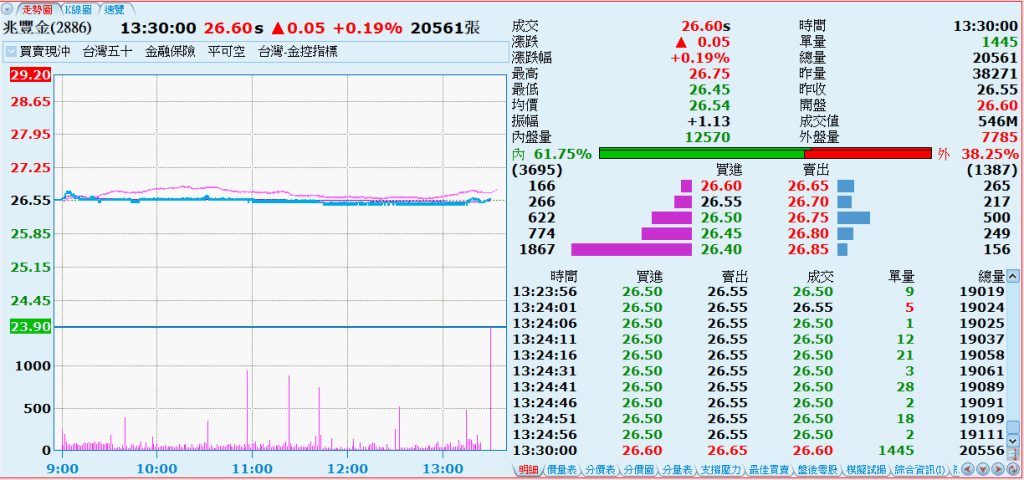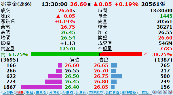 2.內外盤量之比:紅色代表外盤量的比率,綠色代表內盤量的比率。圖中較粗的柱狀,表示開盤迄今累計值的比例圖;而較細的柱狀,表示最近十五分鐘的累計數值比例圖。