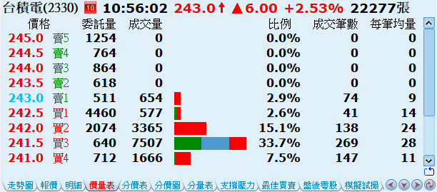 1.列示當日所有成交價位的價格、委託量、成交量、成交量長條圖、成交比重、成交筆數、每筆均量。