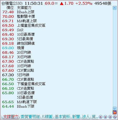 支撐壓力,可作為判斷多空轉換的時點。系統提供22種不同方式計算出的支撐壓力價位(含現價),並由大到小列示。