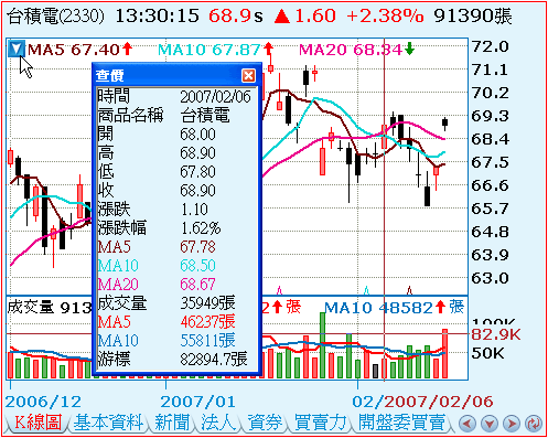 2.滑鼠左鍵於圖中點選2下,即可利用鍵盤的上下左右鍵,查詢線圖上的相關報價資訊。