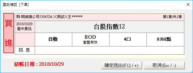 13.以滑鼠左鍵點擊下單列( )按鈕,會彈出「委託確認」下單對話盒如下圖,按下〔確定送出〕鈕,即可送出委託;若按下〔取消〕鈕,則取消此筆委託單的送出動作。
