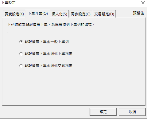 •〔下單介面〕:可選擇點報價帶下單時,要將股票代號、價格帶至〔一般下單列〕、〔迷你下單視窗〕或〔迷你交易視窗〕。